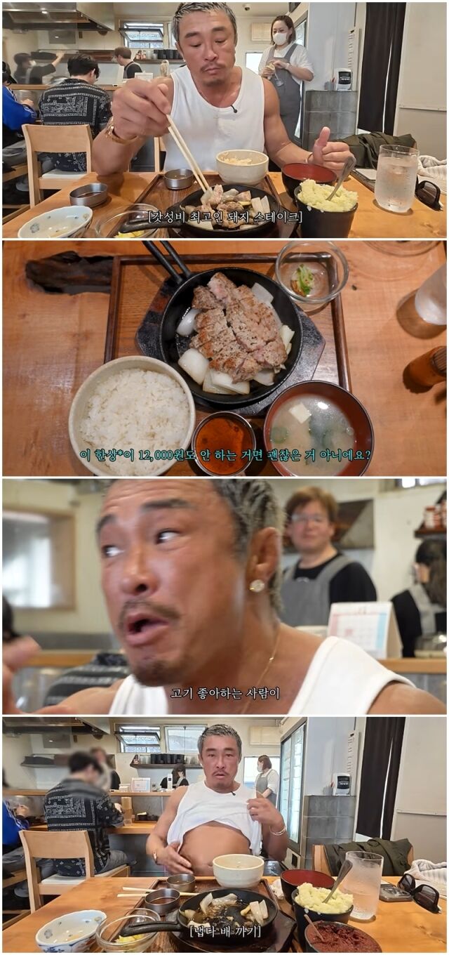추성훈./유튜브이날 추성훈은 690g짜리 스테이크와 밥 두 공기를 깔끔히 비웠다. 식사 후 볼록해진 배를 보이며 "운동선수인데 복근이 다 없어졌다"고 말해 웃음을 자아냈다.
