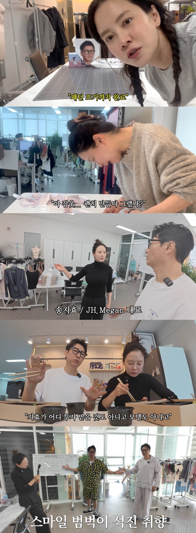 이후 송지효는 사무실에서 잠옷에 대한 간단한 회의를 했고, 다음날 동대문 종합시장으로 향했다. 꼼꼼하게 원단을 고른 그는 사무실로 다시 돌아와 패턴 뜨기까지 직접 마쳤다. 재단까지 나선 송지효는 "멘트도 하고 재밌게 좀 해야 하는데 그럴 여유가 없다"며 "잠옷 괜히 만든다고 그랬나. 트렁크 속옷 만들어줄 걸 그랬나 보다"라며 후회했다.