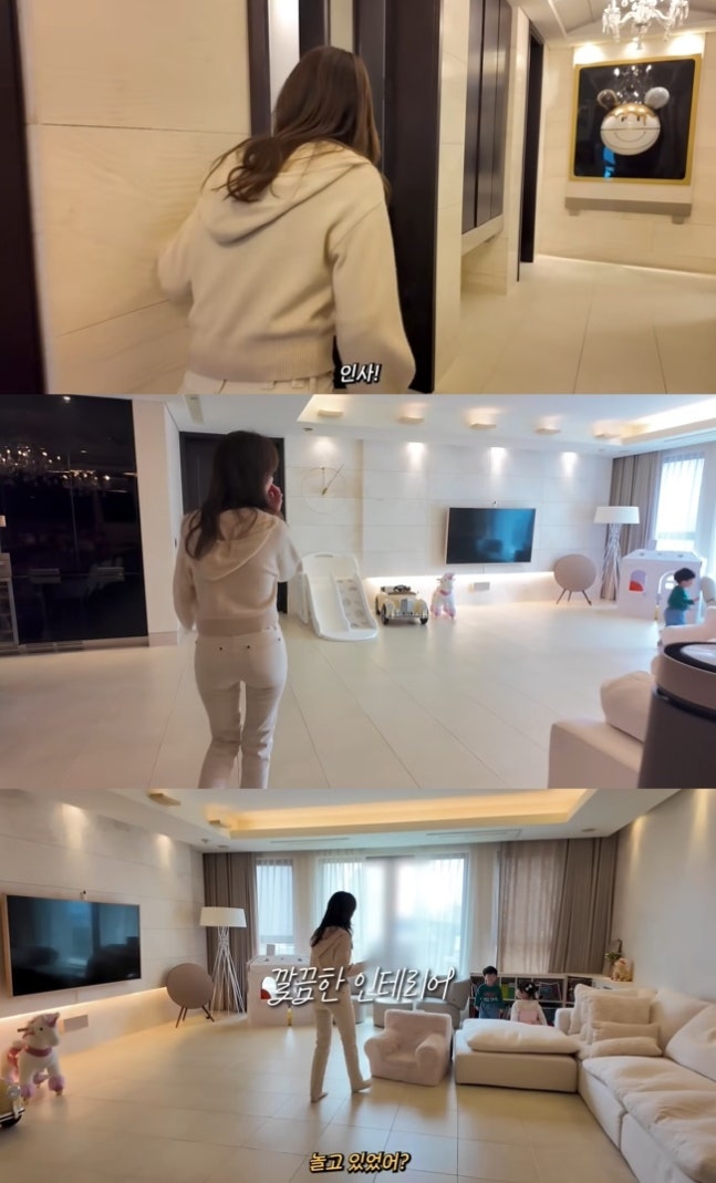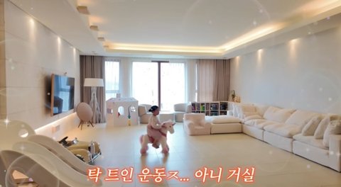 고급스러운 대문이 열리고 공개된 집 내부는 깔끔하고 넓은 복도를 지나 탁 트인 거실이 등장했다. 대형 TV와 화이트 톤의 큰 소파, 아이들의 장난감 차와 승마 완구, 거실 서재가 있어도 아이들이 신나게 뛰어놀 수 있을만큼 널찍했다.