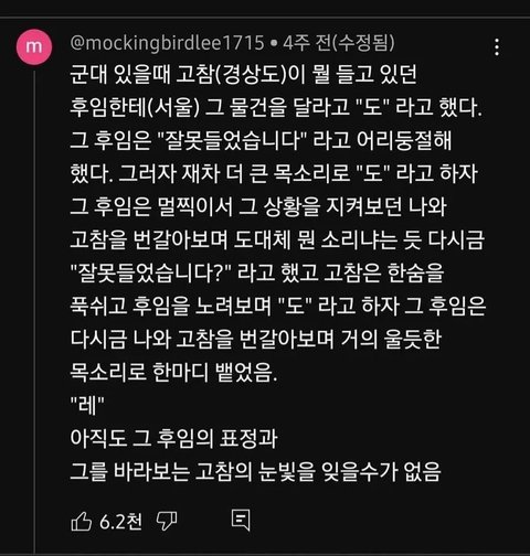 ㅁㄷ ㄹㅇ 근데 유독 경상도가 진짜 고치기 힘듦 충청도나 제주도는 서울말이랑 거의 차이 없고 전라도도 억양만 살짝 고치면 되는데 경상도는 모든 말에 다 억양이 강해서 진짜 고치기 힘든듯