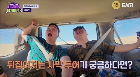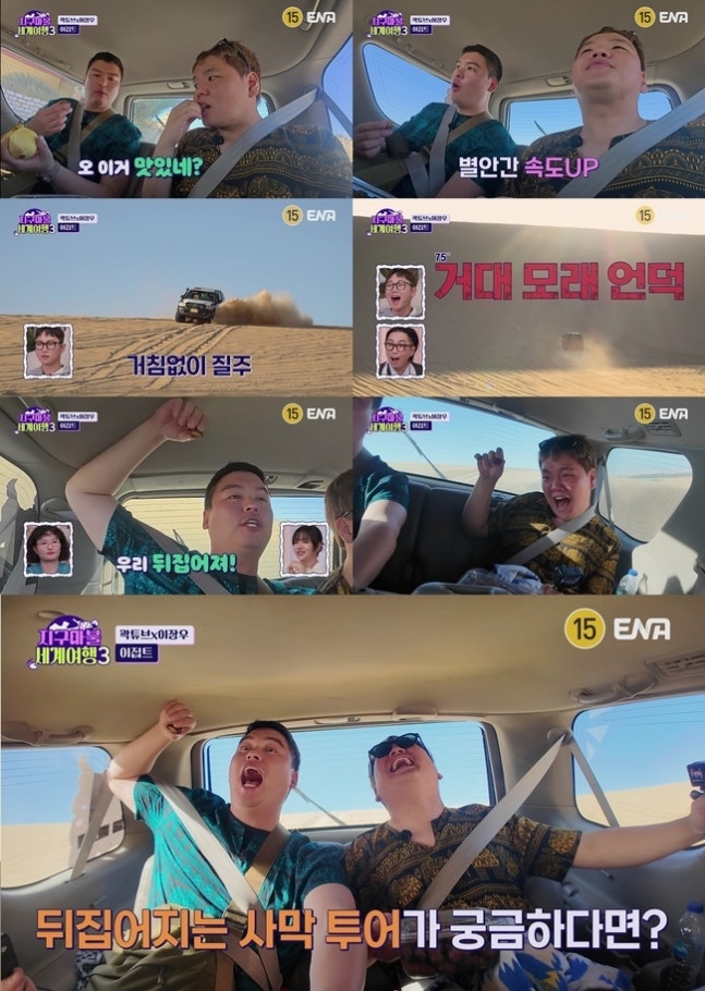 사진제공=ENA, TEO쉴 새 없는 먹방으로 “이집트 간 거 맞냐?”라는 핀잔(?)까지 들은 곽튜브와 이장우는 드디어 완전히 다른 이집트 찐 여행을 이어갔다. 세계에서 가장 큰 사막인 사하라를 찾은 두 사람은 광활한 사막과 경사도가 무려 75도인 가파른 모래 언덕을 엄청난 스피드로 내달리는 오프로더 드라이브에 아찔한 비명을 내질렀다.