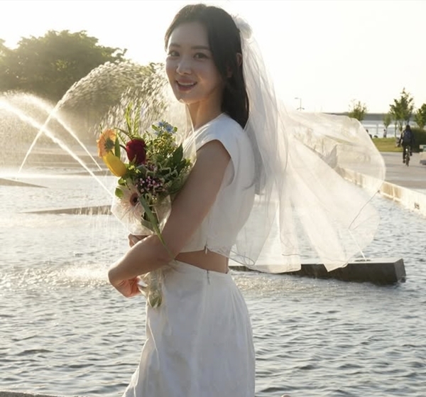 사진 속 김다영은 흰 원피스에 베일을 쓴 채 부케를 들고 분수 앞에 서 있다. 밝은 미소와 수수한 분위기, 그리고 노을과 어우러진 배경이 영락없는 신부의 모습을 떠오르게 한다.