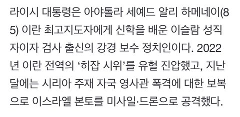 그래서인지 2024년 5월 북한간첩들이 해외재벌과 손잡고 진짜 도널드 트럼프를 죽이고 가짜 대역 트럼프를 내세운 사실을 확인한 이스라엘이 제일 먼저 한 일은 바로 북한에서 2021년부터 이란 대통령으로 세웠던 라이시 대통령을 헬기사고로 위장해 죽인것이었음