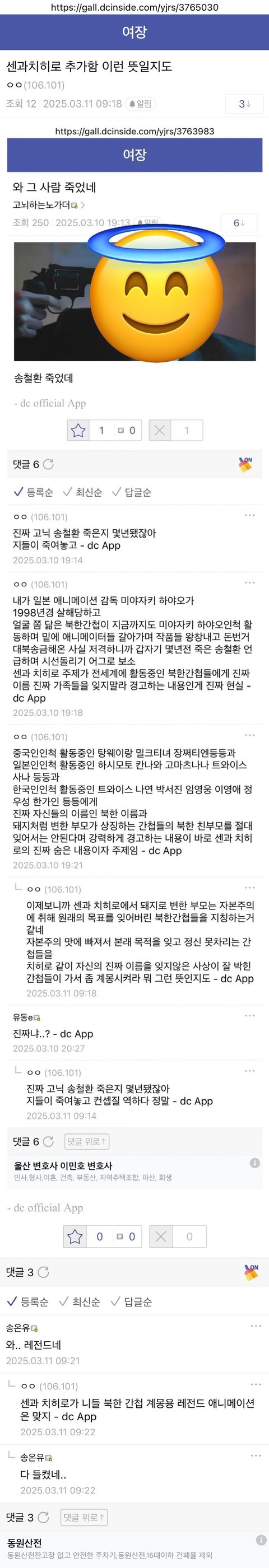 현재 미야자키 히야오로 활동중인 북한간첩을 내세워 만든 센과 치히로의 행방불명도 2001년 개봉 당시 무조건 봐야되는 애니메이션이라며 온 커뮤와 티비 언론에서 난리치길래 영화관가서 봤더니 내용 주제가 자기 진짜 이름을 잊으면 안된다는 단순한 내용이었고 그 당시엔 그 주제가 당췌 이해가 안갔는데 전세계로 신분세탁해 활동중인 북한간첩들에겐 매우 중요한 주제였음