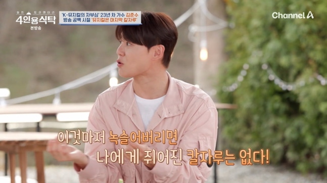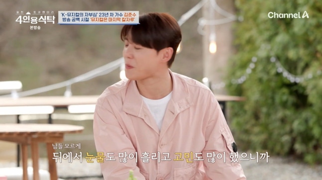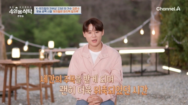 사진=채널A '4인용식탁'소속사 분쟁 후 첫 행보로 뮤지컬을 선택했던 김준수는 "선택권이 뮤지컬 밖에 없었다. 방송을 못 하니까"라며 "죄 지은 것 같았고 팬들에게도 미안했다. 위축되서 외출을 못했다. 손가락질할 것 같아 집에만 있었다"고 이야기했다.