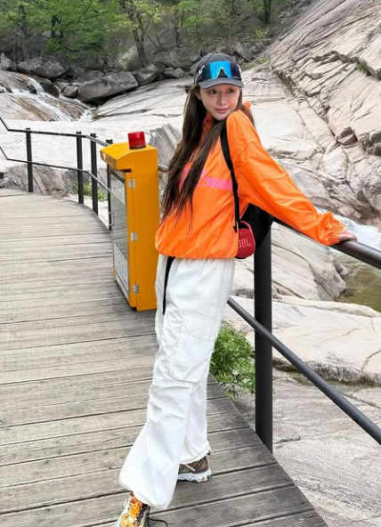 민영 소셜미디어공개된 사진 속 민영은 긴 머리에 선글라스를 겹쳐 놓은 캡모자를 쓰고, 눈에 띄는 주황색 재킷에 하의는 활동이 편한 흰색의 조거 팬츠를 매치해 편안함과 활동성을 겸비한 '등산 룩'을 완성했다.