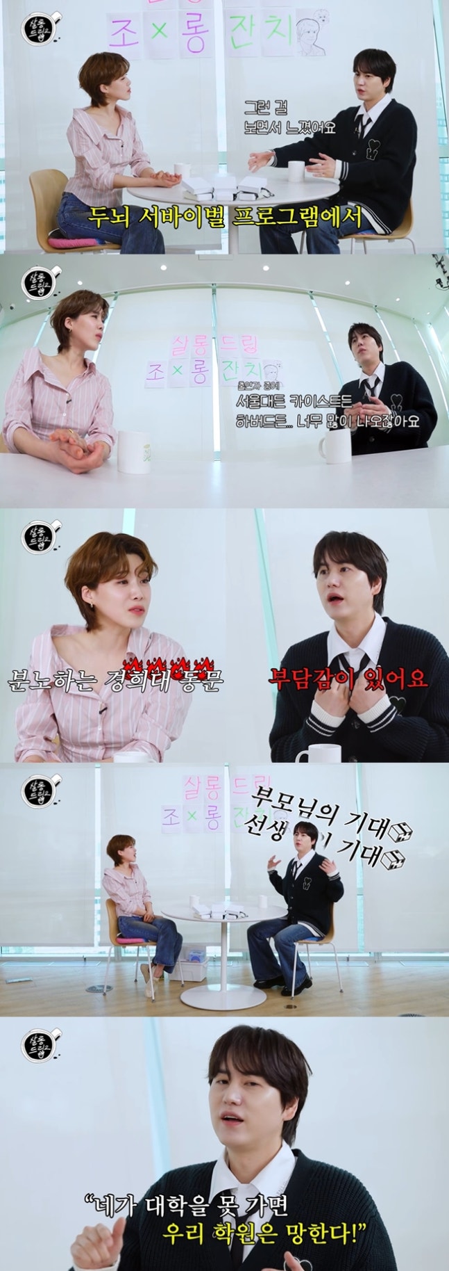 규현은 자신의 모교에 관해 "저한테는 너무 큰 자부심이다. 사실 제가 학벌에 대한 자격지심이 있다. 아버지가 학원을 운영하셨고 계속 6년 동안 들었던 얘기가 '네가 대학을 못 가면 우리 학원은 망한다' 이런 거에 대한 부담감이 있어서 모든 선생님과 아빠, 우리 학원을 등에 업고 공부를 했다"라며 자신의 학벌에 관해 솔직하게 털어놨다.