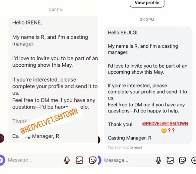 아이린, 슬기가 받은 DM에는 자신을 ‘R’이라고 소개한 캐스팅 매니저가 5월에 있을 쇼에 두 사람을 초대하고 싶다는 내용이 담겼다. 두 사람이 받은 DM의 내용은 같으며, ‘아이린’, ‘슬기’ 이름만 바꿔넣었을 뿐이다.