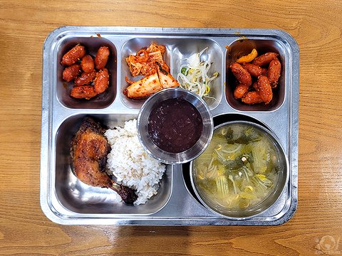 바베큐치킨, 잡곡밥, 우거지콩나물된장국, 비엔나소세지철판볶음, 숙주피쉬소스무침, 포기김치, 후식 단팥죽.