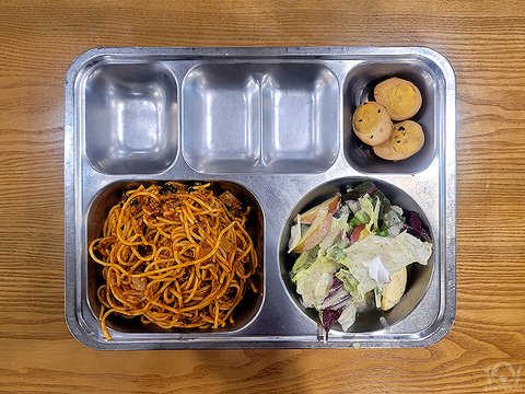 토마토라구파스타, 잡곡밥, 어묵무국, 풋고추달걀장조림, 사과양상추샐러드, 들기름김치볶음.