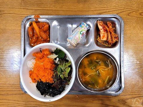 날치알생야채비빔밥, 근대콩나물국, 로제매콤떡볶이, 이오요구르트, 포기김치.