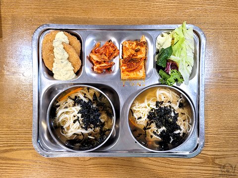 통살새우까스, 잡곡밥, 멸치잔치국수, 류수영표두부조림, 사과양상추샐러드, 포기김치.