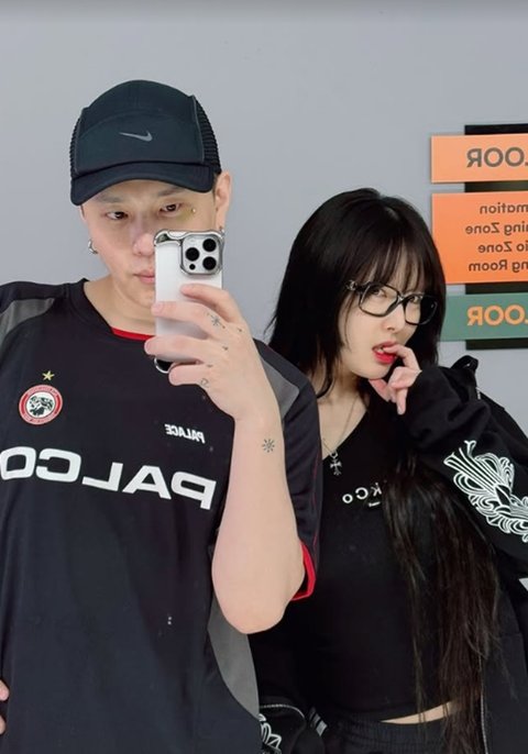 현아와 용준형은 나란히 서서 거울 셀카를 찍고 있다. 용준형은 눈가의 피어싱, 현아는 빨간 립스틱으로 더욱 치명적인 매력을 발산해 눈길을 끌었다.