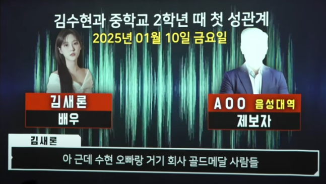 또 김세의는 제보자와 김새론이 나눴다고 주장한 대화 녹취록을 공개했다. 공개된 녹취록에서 김새론이라 주장하는 인물은 "수현 오빠랑 사귀었다. 중학교 때부터 사귀다가 대학교 들어가서 좀 있다가 헤어졌다"고 말했다.