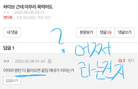 방탄 다 돌아오면 끝임 얘네가 이러는거 라고 댓글 쓴 빅사모야 방탄 와서 뭐 어쩌라는거임?ㅋㅋ방탄 돌아오면 느그방시혁이랑 하이브의 민심 회복이 될꺼라고 생각하는거임?ㅉㅋㅋ착각하지말구 정신을 차리세요 방탄이랑 상관없이 니네시혁이랑 하이브의 인성논란,다른 그룹 아이돌을 욕한 문건논란,에스파를 밀어낼려고 음반사재기 할려고 한 논란까지 다 나온건 변하지 않으니깐 추하게 방탄을 이용하는 행동 정도껏하세요ㅉ