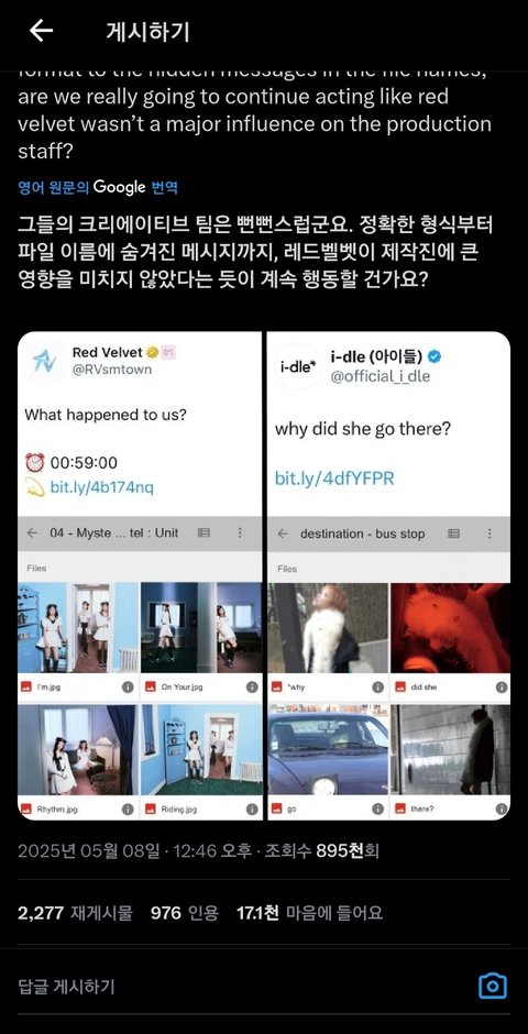 옷 비슷한것도 아이들이 레드벨벳을 참고한 게 아니라 큐브 스엠 디자인 팀들이 우연히 같은 레퍼런스 참고한 거겠지ㅋㅋ 둘 다 같은 핀터 봤다는거라고 레밸팬들 바이럴 희한하게하네;; 몇 번 째 글 쓰는 거임