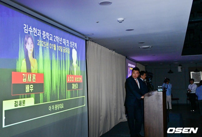 [OSEN=박준형 기자] 7일 오후 서울 삼성동 스페이스쉐어에서 가세연 김수현 관련 폭로 기자회견이 진행됐다.배우 김수현이 미성년자였던 故 김새론과 교제했다는 의혹을 제기하며 여러 폭로를 이어온 가로세로연구소(약칭 가세연) 측이 김수현의 중범죄를 폭로하겠다며 기자회견을 마련했다. 이에 김수현 측은 고인이 미성년자였을 당시 교제한 적이 없다고 부인하면서 김새론 유족과 가세연을 상대로 120억 원대의 손해배상 소송을 제기한 상태다.故 김새론 녹취록이 공개되고 있다. / 2025.05.07 / soul1014@osen.co.kr이에 부지석 변호사는 유족 측이 김수현을 상대로 아동복지법위반 및 무고죄로 고소장을 제출했다며 “유족 측은 김수현이 故 김새론 양이 미성년자인 중학교 2학년 겨울방학 때부터 故 김새론 양에게 음란한 행위를 시키거나 성희롱 등 성적 학대행위를 하였음을 확인하여 아동복지법위반으로 고소를 진행했다”고 말했다.