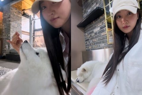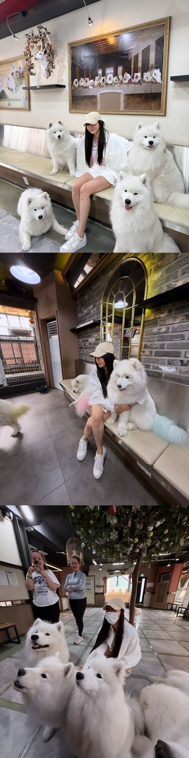 공개된 사진에는 김사랑이 사모예드 여러 마리와 함께 여유로운 시간을 보내는 모습이 담겼다. 그는 화이트 셔츠에 모자를 착용하고 대형견들과 함께 포근한 분위기를 연출했다.
