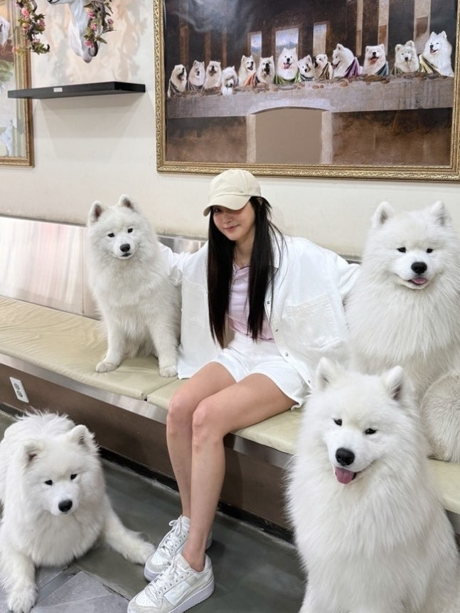 김사랑 소셜네트워크서비스 계정사진 속엔 견종 사모예드가 모여있는 한 애견카페에 찾은 김사랑의 모습이 담겨 있다. 사모예드 사이에서 인증샷을 남긴 김사랑은 사모예드를 꼭 껴안고 교감하는 모습도 보여줬다. 제대로 힐링을 즐기는 일상 속, 뱀파이어 같은 김사랑의 동안 외모도 눈길을 사로잡는다. 20대라고 해도 믿을 법한 미모가 감탄을 유발한다.