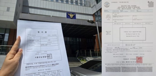 그는 "기자회견을 보고 있던 남편이 '빨리 출입국기록서를 발급 받으라'고 연락했다"라며 당시 인터넷으로 발급 받은 2025년 1월 1일부터 5월 5일까지의 출입국기록서를 공개했다.