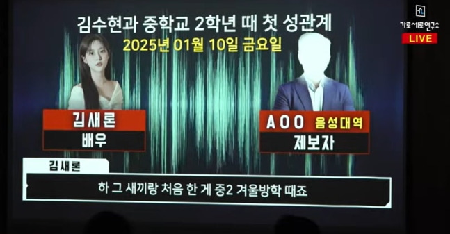 이들이 공개한 김새론의 녹취라 주장하는 내용에는 "저 수현 오빠랑 사귀었다. 미쳤다고 안 믿겠지만, 중학교 때부터 사귀다가 대학교 들어가서 좀 있다가 헤어졌다. 중학교 때부터 이용 당한 느낌이다. 처음 (성관계) 한 게 중2 겨울방학 때였다. 지금 생각하면 당했다고 해야 하나. 다들 똑같은 반응이다. 왜 가만 두냐고"라고 했다.