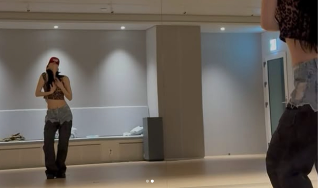 첫 번째 컷은 안무 연습실. 크롭 레오파드 탑에 워싱 데님 팬츠를 매치하고, 레드 볼캡을 깊게 눌러쓴 채 퍼포먼스에 몰입한 모습이다. 루즈한 실루엣의 하의와 날렵한 상체 라인이 조화를 이루며, 무대 위 아티스트로서의 존재감을 암시했다.
