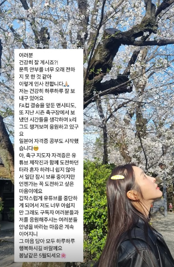 정유미는 "A컵 결승을 앞둔 맨시티도, 또 지난 시즌 축구장에서 보냈던 시간을 생각하며 K리그도 챙겨보며 응원하고 있다"며 "일본어 자격증 공부도 시작했다. 축구 지도자 자격증은 유튜브 제작진과 함께 도전하던 터라 혼자 하려니 쉽지 않아서 일단 잠시 보류 중이지만 언젠가는 꼭 도전하고 싶은 마음"이라고 전했다.