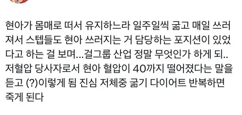 아이돌들 보면 항상 패턴이 이럼.잘 먹고 건강하고 어쩌고 한다지만 사실은 아니란거.근데 진짜 그 ‘뼈말라’상태가 아닌 이상 운동 니보다 많이한다,연습량 많다,타고난거다,대식가다 잘 먹는다...등의 얘기 주구장창 달리면서 마른 몸을 찬양함.또 찌면 쪘다고 염병을 함.