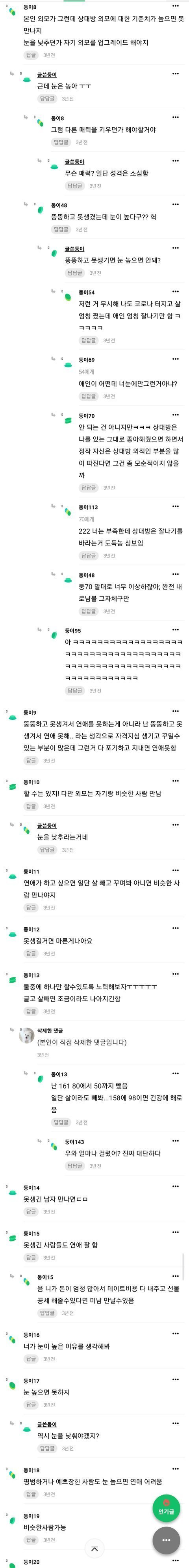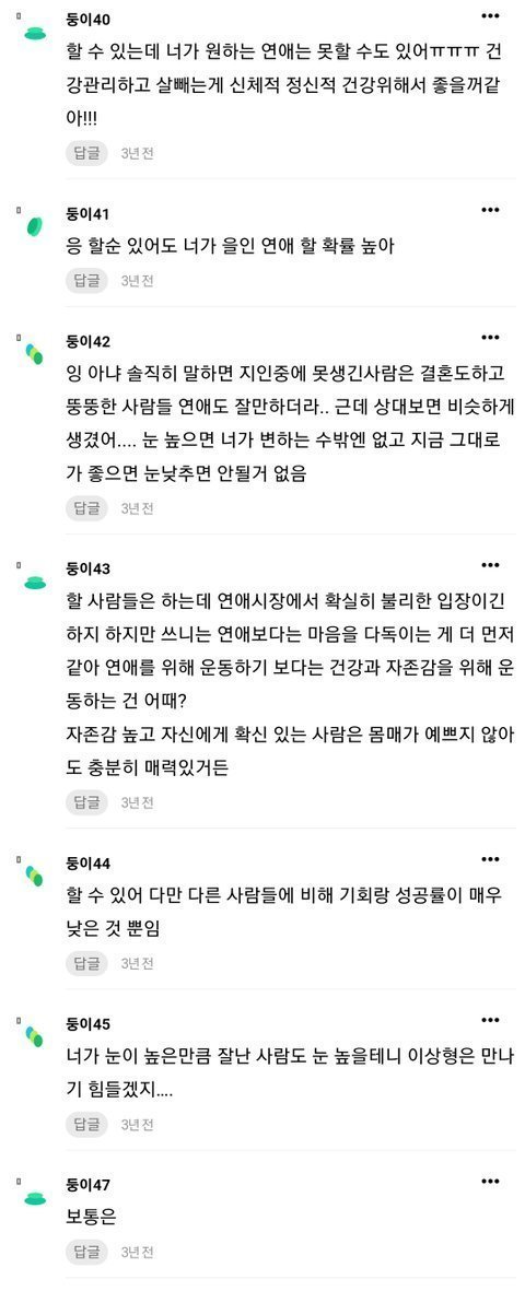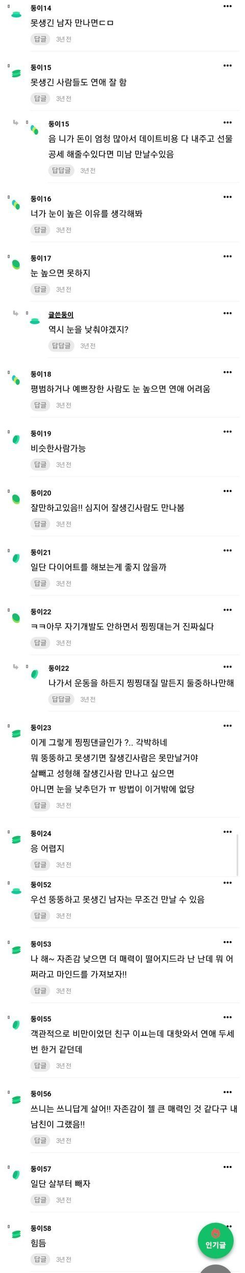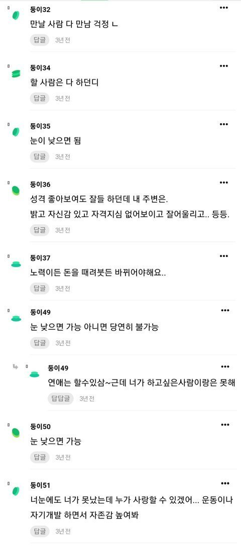 뚱뚱하고 엄청 못생긴 애들 다 연애 잘 하던데 결혼도 하는데 뭐. 눈낮추면 외모가 뭔들 가능하다...