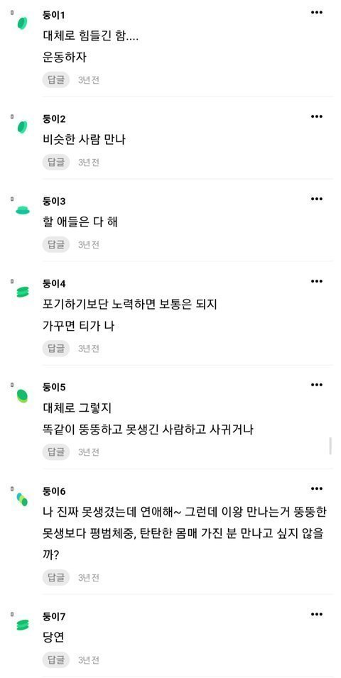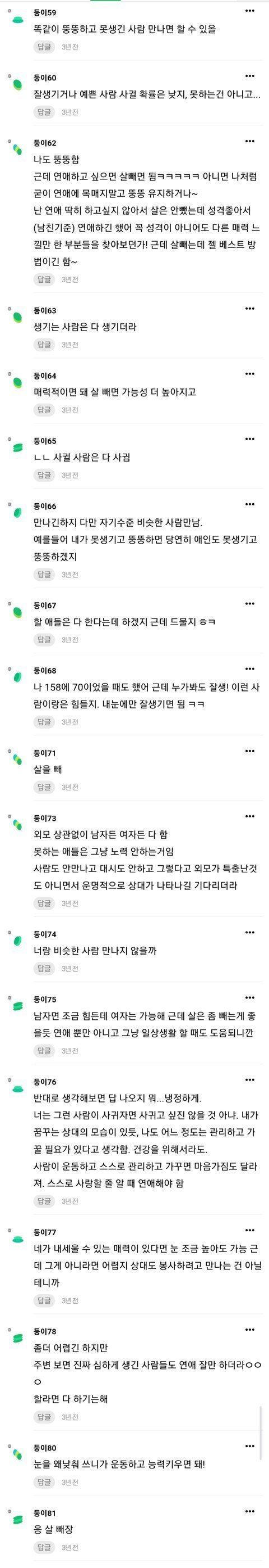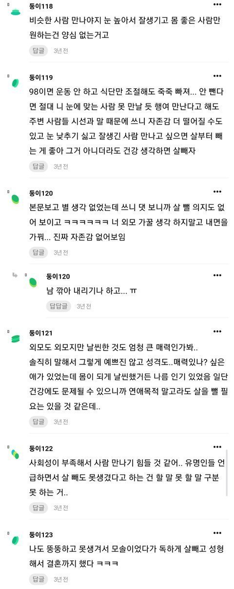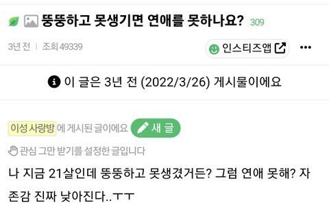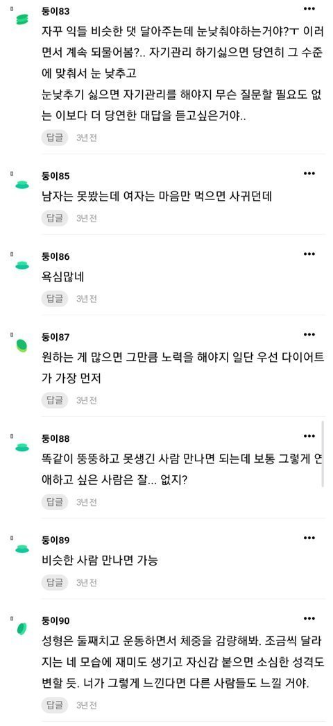 뚱뚱하고 엄청 못생긴 애들 다 연애 잘 하던데 결혼도 하는데 뭐. 눈낮추면 외모가 뭔들 가능하다...