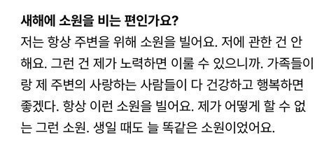 "그런 건 제가 노력하면 이룰 수 있으니까. 가족들이랑 제 주변의 사랑하는 사람들이 다 건강하고 행복하면 좋겠다. 항상 이런 소원을 빌어요. 제가 어떻게 할 수 없는 그런 소원. 생일 때도 늘 똑같은 소원이었어요."