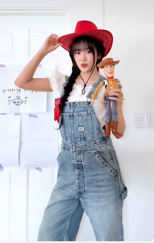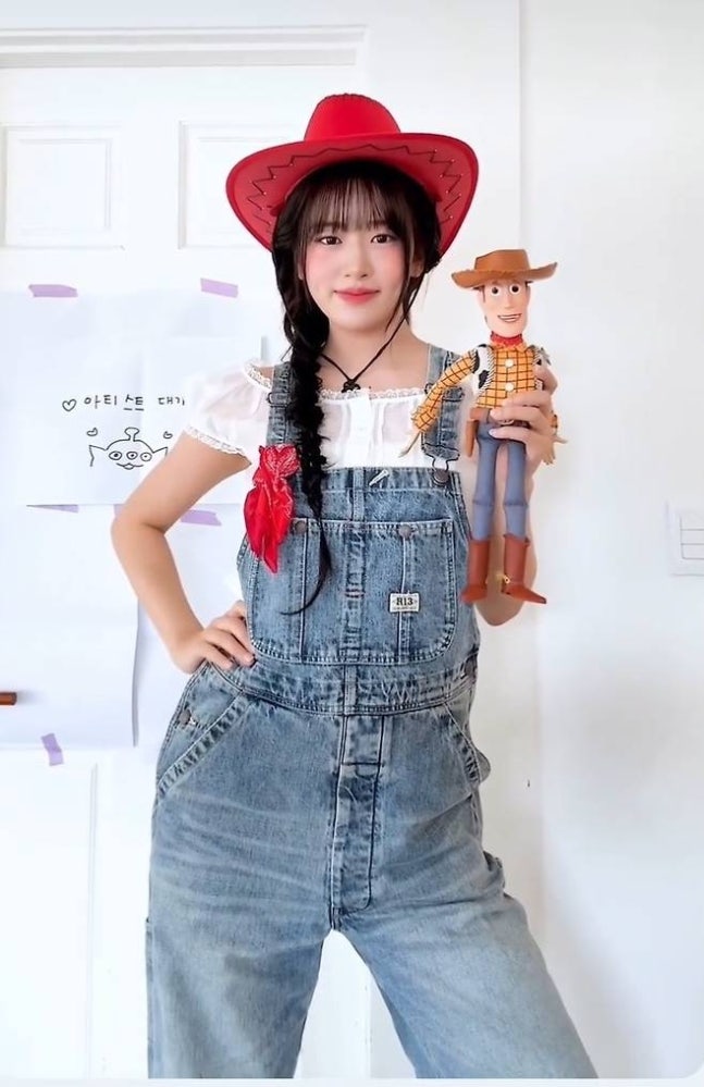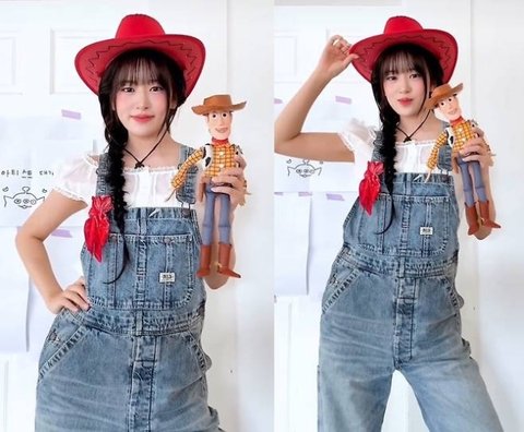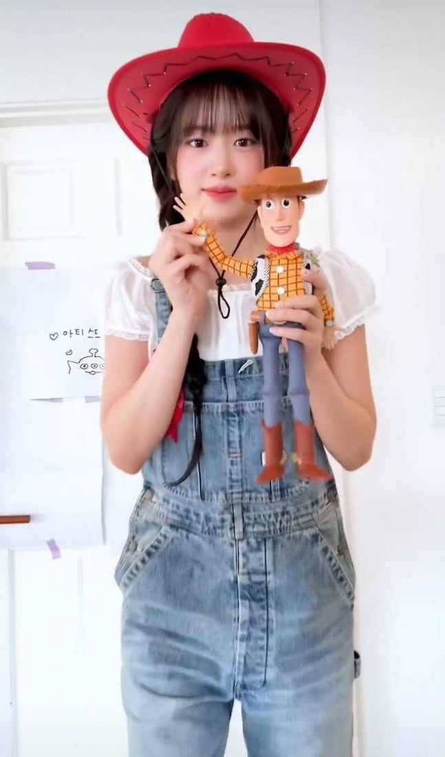 장난기 가득한 표정과 포즈로 카우보이 인형 ‘우디’와의 케미스트리를 뽐내며 팬들의 뜨거운 반응을 이끌었다.사진=안유진 SNS