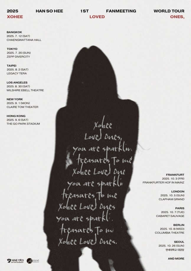 소속사 9아토엔터테인먼트는 14일 오후 공식 SNS 채널을 통해 ‘2025 HAN SO HEE 1st FANMEETING WORLD TOUR [Xohee Loved Ones,](2025 한소희 퍼스트 팬미팅 월드투어 [소희 러브드 원즈,])’의 투어맵 포스터를 오픈하며 글로벌 팬들과의 만남을 본격 예고했다.