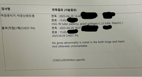 4월 25일 진료에서 “나팔관 조영술을 하지 않았으니, 정확한 상태를 확인하려면 조영술을 받아야 한다”고 하셔서 4월 29일에 조영술을 예약했습니다.