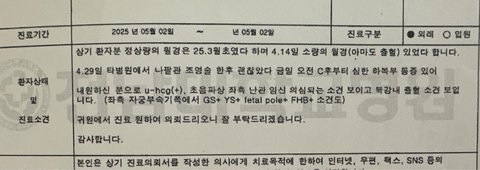 당일 질초음파 후 조영술을 진행했고, 결과는 바로 설명해주셨습니다. “자궁내막이 두껍다”는 말씀은 있었지만, 왜 그런지, 추후 어떤 관리가 필요한지에 대한 설명은 전혀 없었고, 5월 10일쯤 다시 오라는 이야기뿐이었습니다.