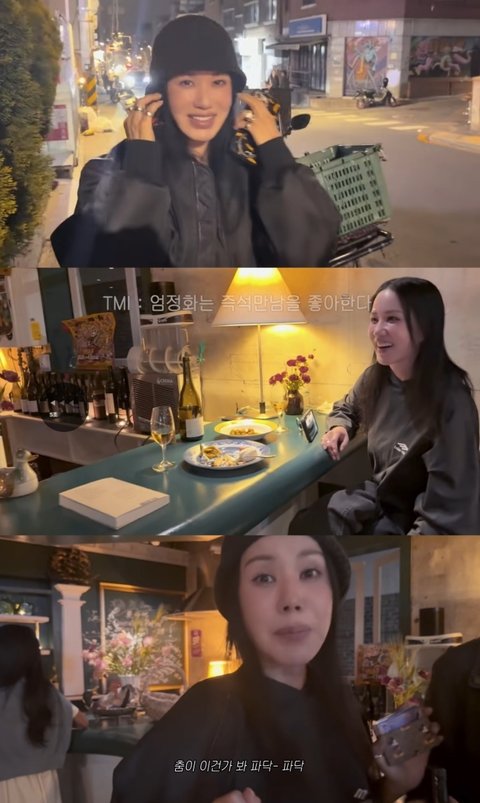 이날 엄정화는 김종민 결혼식에 참석한 뒤 화사, 정재형, 장우영이 있는 곳으로 합류, 급결성된 모임을 신나게 즐겼다.