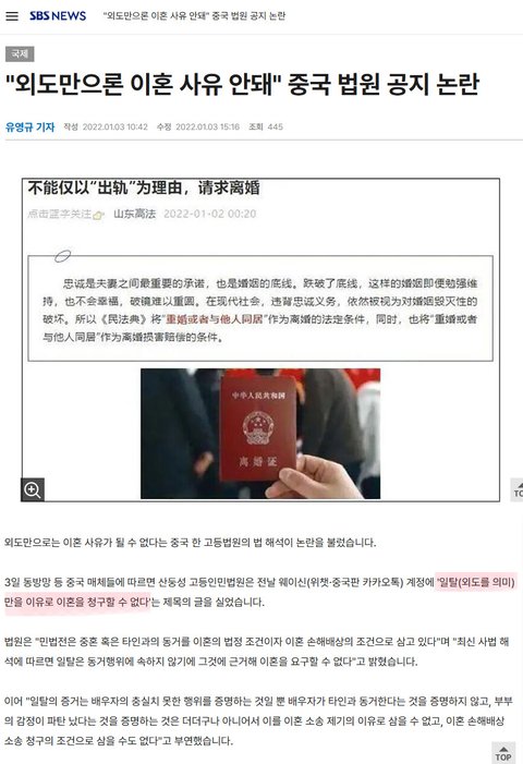 외도는 법원에서 이혼 사유 인정 안되고 이혼 시험 보고 합격해야 이혼 할수 있는 나라가 중국이다