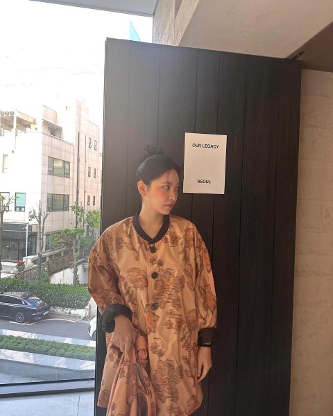 사진 속 예리는 단정하게 묶어올린 헤어스타일로 깔끔한 이목구비를 드러낸다. 화사하지만 수수한 메이크업이 사각의 실내와 대조돼 도시의 오후 정취와 어우러졌다. 넉넉하고 고전적인 꽃무늬 패턴의 코트가 은은한 빛 아래 부드럽게 빛난다. 코트와 같은 소재의 천을 자연스럽게 손에 쥐고 있는 동작이 세련되면서도 내추럴한 분위기를 자아낸다. 브라운 컬러 벽면에 ‘OUR LEGACY SEOUL’이라는 간결한 문구가 걸려 있으며, 커다란 유리창 너머로는 싱그럽게 초록잎이 돋은 봄날의 서울 거리 풍광이 보인다. 실내와 외부의 경계, 계절의 온기와 시간의 고요함까지, 모든 것이 예리의 표정과 유려하게 겹쳐진다.