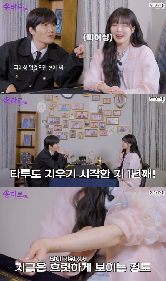 채널 ‘이용진 유튜브’이에 이용진은 "피어싱 없었으면 현아 씨인 줄 못 알아볼 뻔했다"고 장난치자 현아는 "아직도 제가 싸워요. 스스로. 피어싱은 마지막 정체성이다. 타투를 지운 지 1년 정도 됐다. 전신에 타투가 많았는데 지우는데 시간이 많이 들더라. 엄마가 한 번만 깨끗한 몸으로 지내보면 어떻겠냐고 물어보셔서 지우고 있는데 너무 아프다. 4번 정도 받고 쉬고 있다. 두 달에 한 번씩 받고 있다"고 말해 눈길을 끌었다.