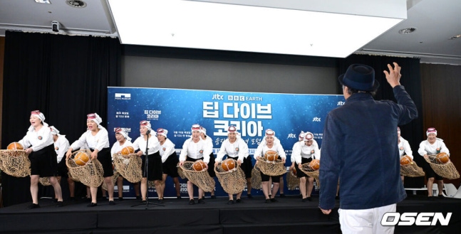 [OSEN=최규한 기자] 15일 오후 서울 상암동 스텐포드 호텔에서 JTBC 신규 프로그램 ‘딥 다이브 코리아: 송지효의 해녀 모험’(약칭 딥다이브) 제작발표회가 열렸다.딥다이브는 송지효가 제주에서 해녀 물질에 도전하고 그들과 진정한 유대감을 형성해 나가는 여정을 그린 다큐멘터리 프로그램이다. JTBC와 BBC 스튜디오의 첫 공동 제작 콘텐트이자 국내 방송사 중 최초로 BBC 스튜디오와 공동 제작한 사례로 많은 이들의 주목을 받고 있다.하도 해녀 합창단이 공연을 펼치고 있다. 2025.05.15 / dreamer@osen.co.kr송지효는 배우, 예능인을 넘어 속옷 브랜드 CEO로도 활동 중이다. 다양한 도전을 거침없이 하면서 끊임없이 새로운 매력을 선사하고 있는 송지효. 최근에는 사업에 대한 근심이 크다며 “하루에 1~2개 팔린다”는 고충을 토로하기도 했지만 김종국의 유튜브 채널 ‘짐종국’ 출연 후 판매 부진을 털었다고 밝혀 화제가 됐다.