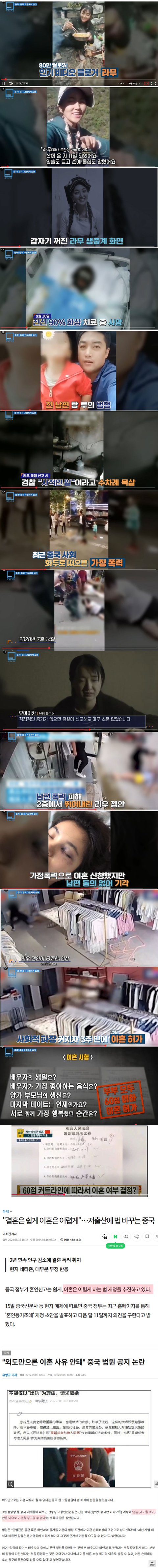 중국에서 외도, 가정폭력은 이혼 사유가 안됨. 가정폭력에 대한 결정적 증거를 제출해야만 이혼사유에 해당하고, 이혼 하려면 이혼시험도 봐서 합격해야하고 대부분은 남편 동의 없으면 이혼 힘듬.