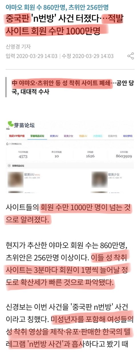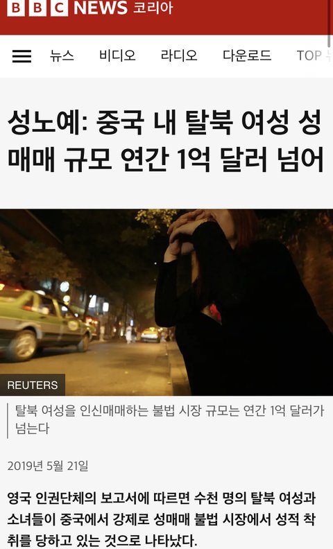 몇년전 보도된 뉴스로 중국 여성 성 착취물 사이트 가입자만 1천만명이 넘었음. 중국에는 북한에서 탈출한 탈북 여성/ 장애인 여성 납치해서 사고 파는 시장 형성 되어있는데 연간 규모가 1억달러 한국 돈으로 1400억이 넘는 수준임.