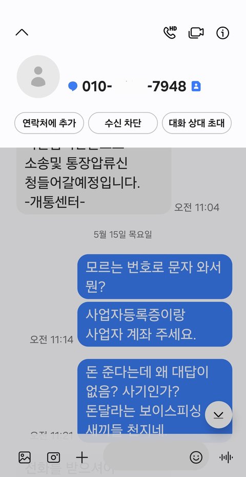 6. 문자로 계약 업체가 맞다면 지원금은 돌려줄테니 사업자등록증과 사업자 계좌를 요구하자 해당 업체는 문자로는 답변을 회피하며 전화로만 얘기 할 것을 요구함.