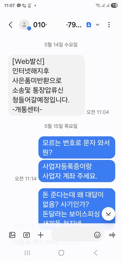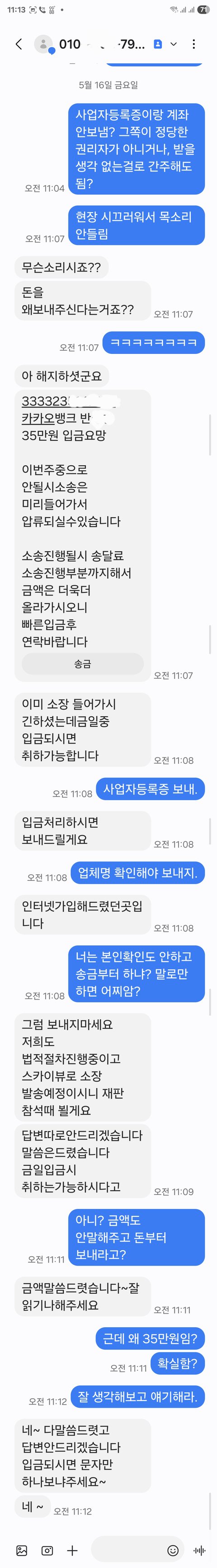 7. 방금 문자와서 협박하길, 35만원을 요구함. 13만원 상품권은 본사에서 회수했기 때문에 22만원만 주면 되나 그 이상을 요구하며 이미고소했다 협박중임.