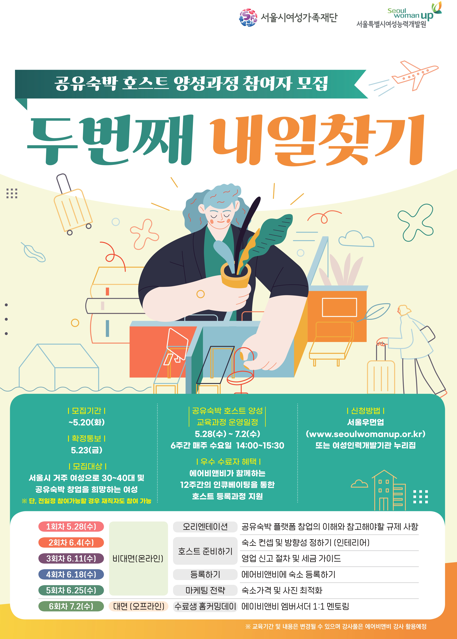 공유숙박 쪽으로 관심 있으셨던 분들 계실까 해서정보 하나 조심스럽게 공유해네요서울시 거주하는 여성 대상이고,무료로 교육도 진행되고 나중에 호스트 등록까지 지원해주는 과정이라고 하더라구요.저도 요즘 이런 쪽 관심 있어서 살펴보다가 알게 됐는데내용이 괜찮아서 혹시나 필요하신 분 계실까 봐 글 남겨봐요