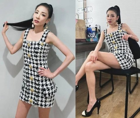 산다라박은 블랙&화이트 하운즈투스 체크 패턴의 트위드 미니 원피스를 완벽하게 소화하며 눈길을 끌었다. 사진=산다라박 SNS넓은 숄더 스트랩과 슬림한 실루엣, 옐로 골드 포인트 단추가 고급스러움을 더하며 세련된 무드를 완성했다.특히 산다라박은 39kg의 극세사 몸매와 한 치의 군살 없는 각선미로 “바나나 한 개도 배불러”라는 자신의 유행 멘트를 실감케 했다. 하이힐과 포니테일 헤어, 볼드한 드롭 이어링으로 러블리+시크한 분위기를 동시에 연출했다.