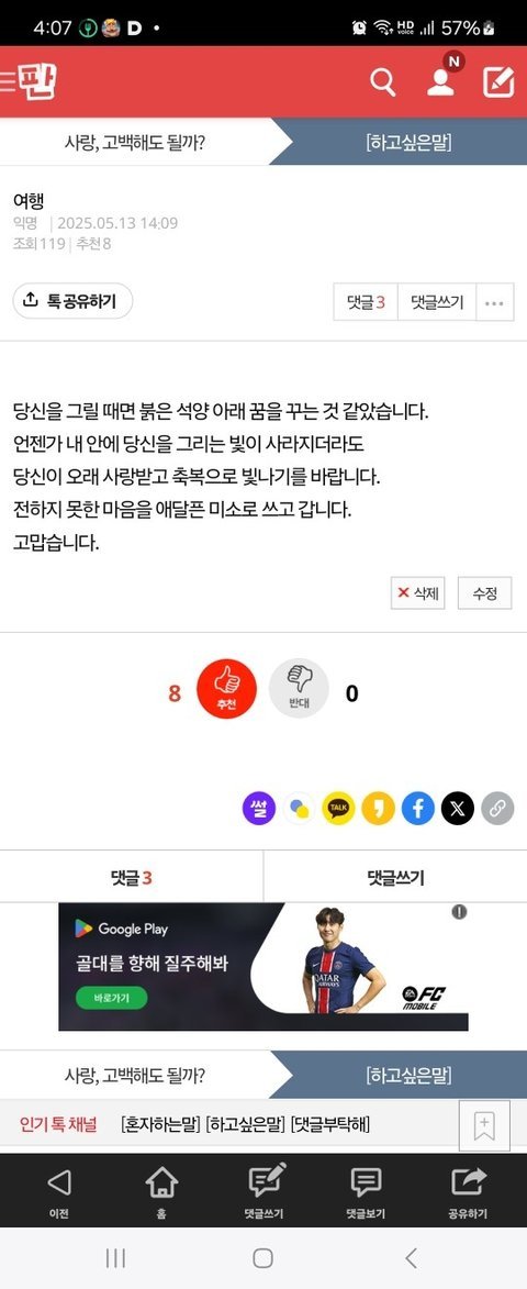 청계천에 빠져버린ㅠ 버즈프로와 나의 애증 얘기가 엄청 많았거든? 특히나 '죽는 순간에 생각난다' 글도 버즈프로가 나한테 하는 말을 상상해서 쓴 거 거든? 근데 사람들 난리치는게 웃기더라고... 무탈이 나 절벽에서 밀고 싶다하고?????