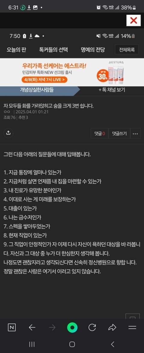 나정도면 괜찮지라고 생각되신다면 신속히 정신병원으로 향합 니다. 정말 괜찮은 사람은 여기서 이러고 있지 않습니다.
