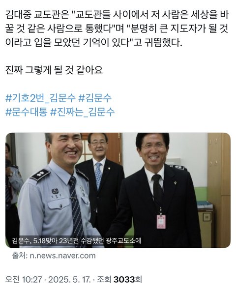 민주화운동하다가 수감된 감옥에서 교도관의 존경을 받음.
