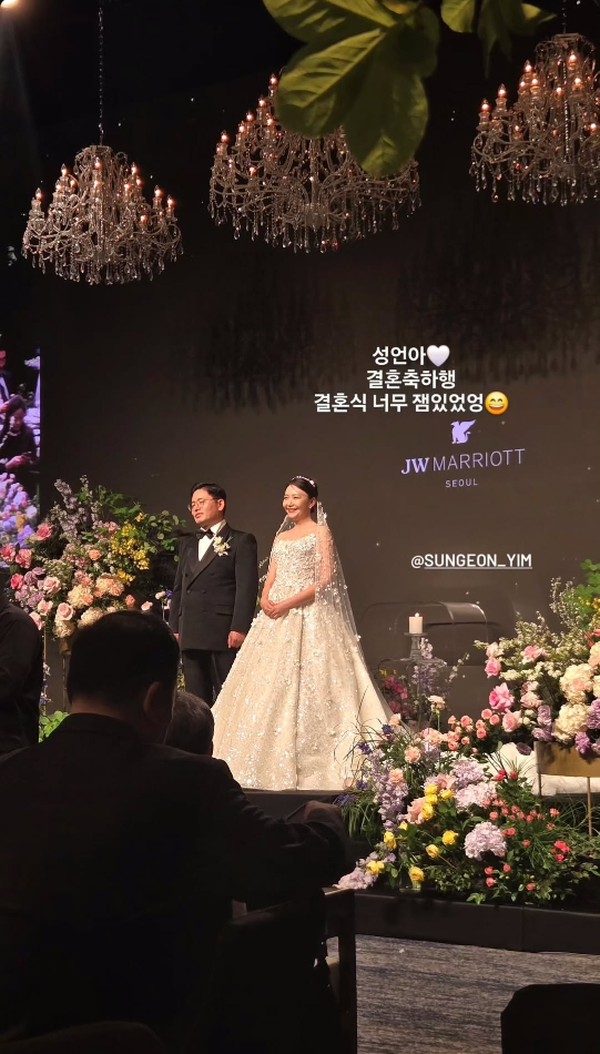 신랑은 비연예인 사업가로 알려졌으며, 이날 예식은 가족과 가까운 지인들만 참석한 가운데 조용히 진행됐다.사진=김사희 SNS현장을 찾은 배우 김사희는 SNS를 통해 “성언아 결혼축하행, 결혼식 너무 재밌었엉”이라는 글과 함께 웨딩 사진을 공개했다.사진 속 임성언은 화려한 비즈 자수의 오프숄더 드레스를 입고 단아한 미소를 짓고 있다. 크리스털 샹들리에 아래에서 우아하게 선 그의 모습에 “이 언니 오늘 찢었다”는 감탄이 이어졌다.